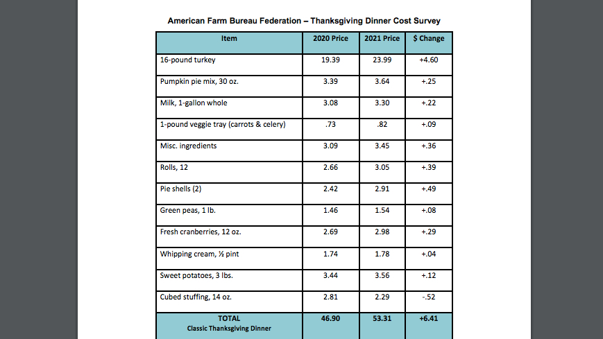 According to the results of an annual survey by the American Farm Bureau Federation, the average cost of Thanksgiving feasts is projected to rise by 14% in 2021.